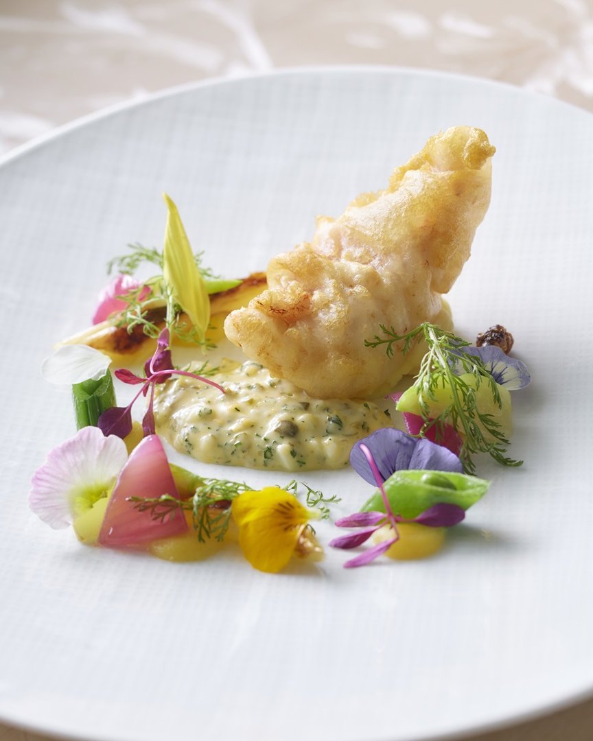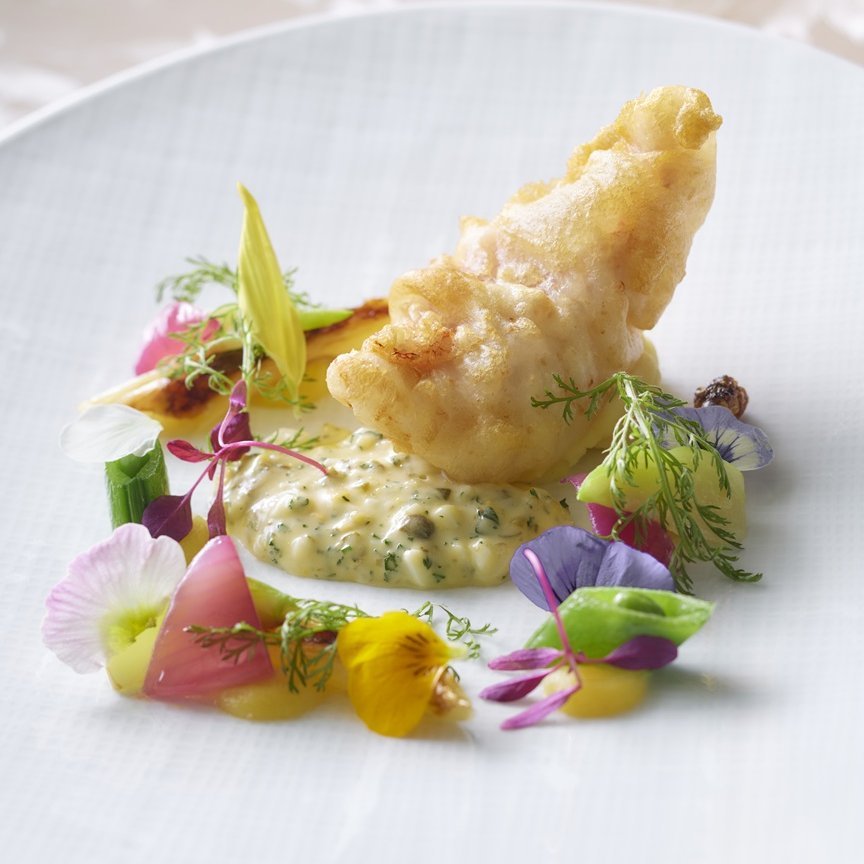 B【魚料理】カサゴのベニエ グリビッシュソース 佐賀県産ホワイトアスパラガスのローストを添えて