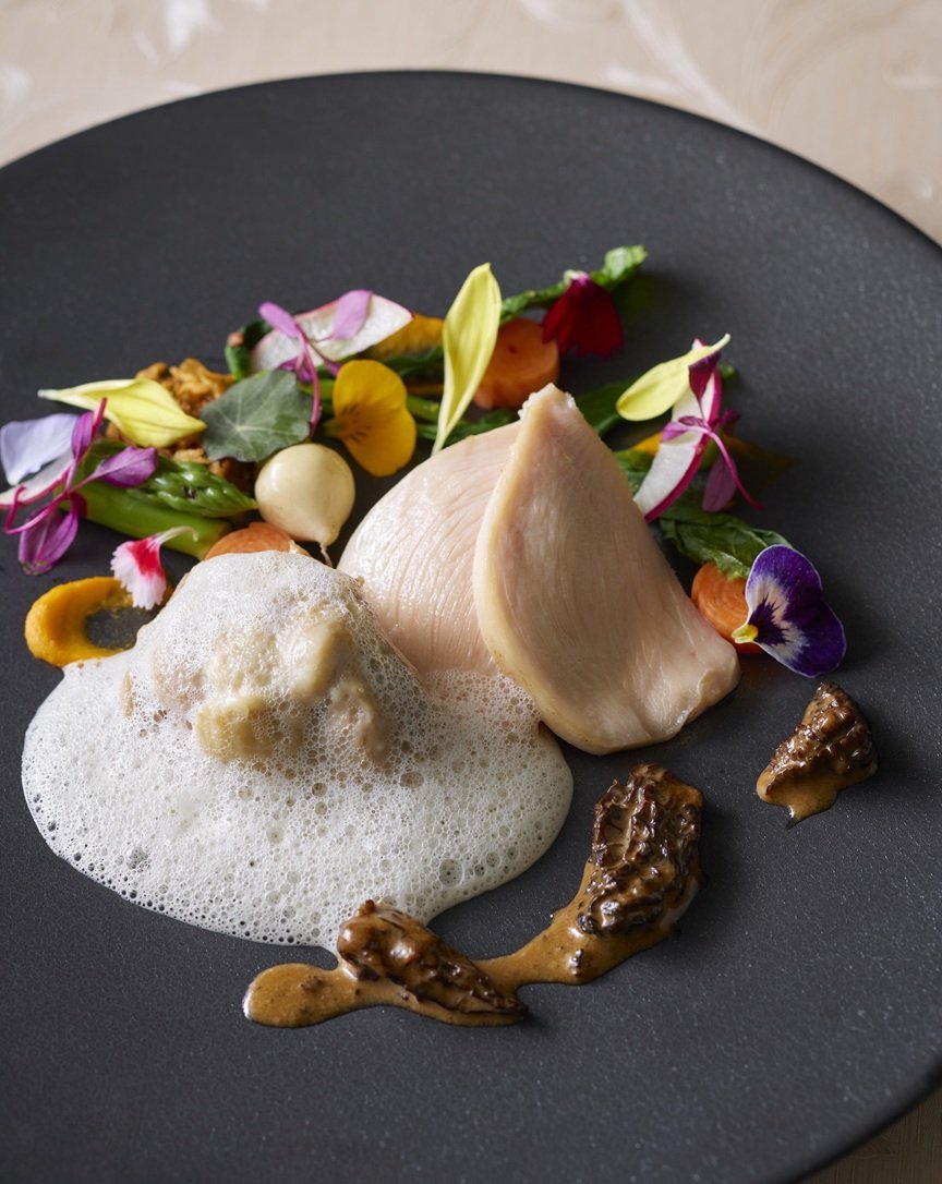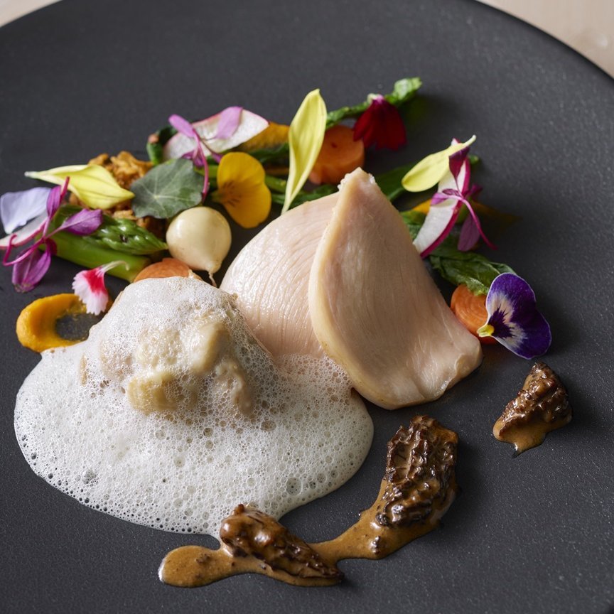 C【肉料理】国産若鶏のフリカッセ ヴァンジョーヌソースとモリーユ茸の香りに包まれて