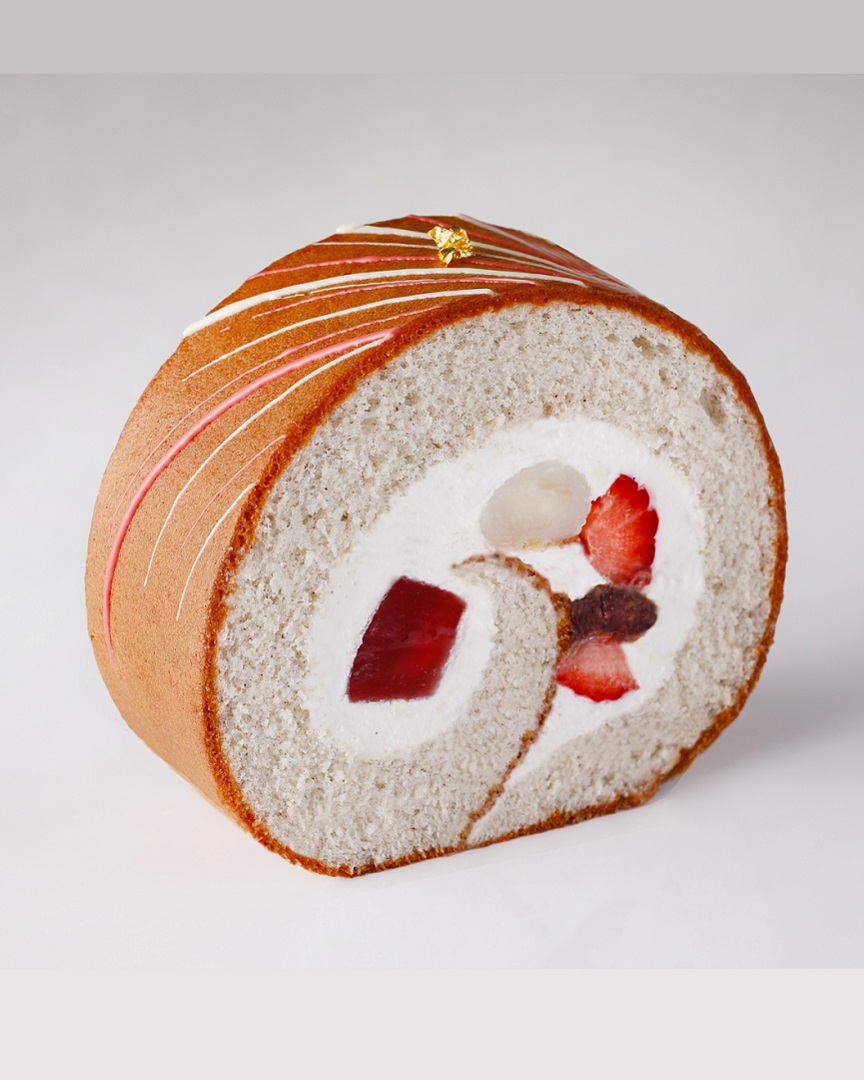 玄米を食べて育った鶏の「玄米卵」を使用したロール生地に、ホテルオリジナル雑穀「Jシリアル」を加え、くちどけなめらかな九州大牟田産生クリームで「博多あまおう」を包み込みました。いちごの酸味や和の風味を感じる小粒大福と黒蜜あんこをお愉しみください。