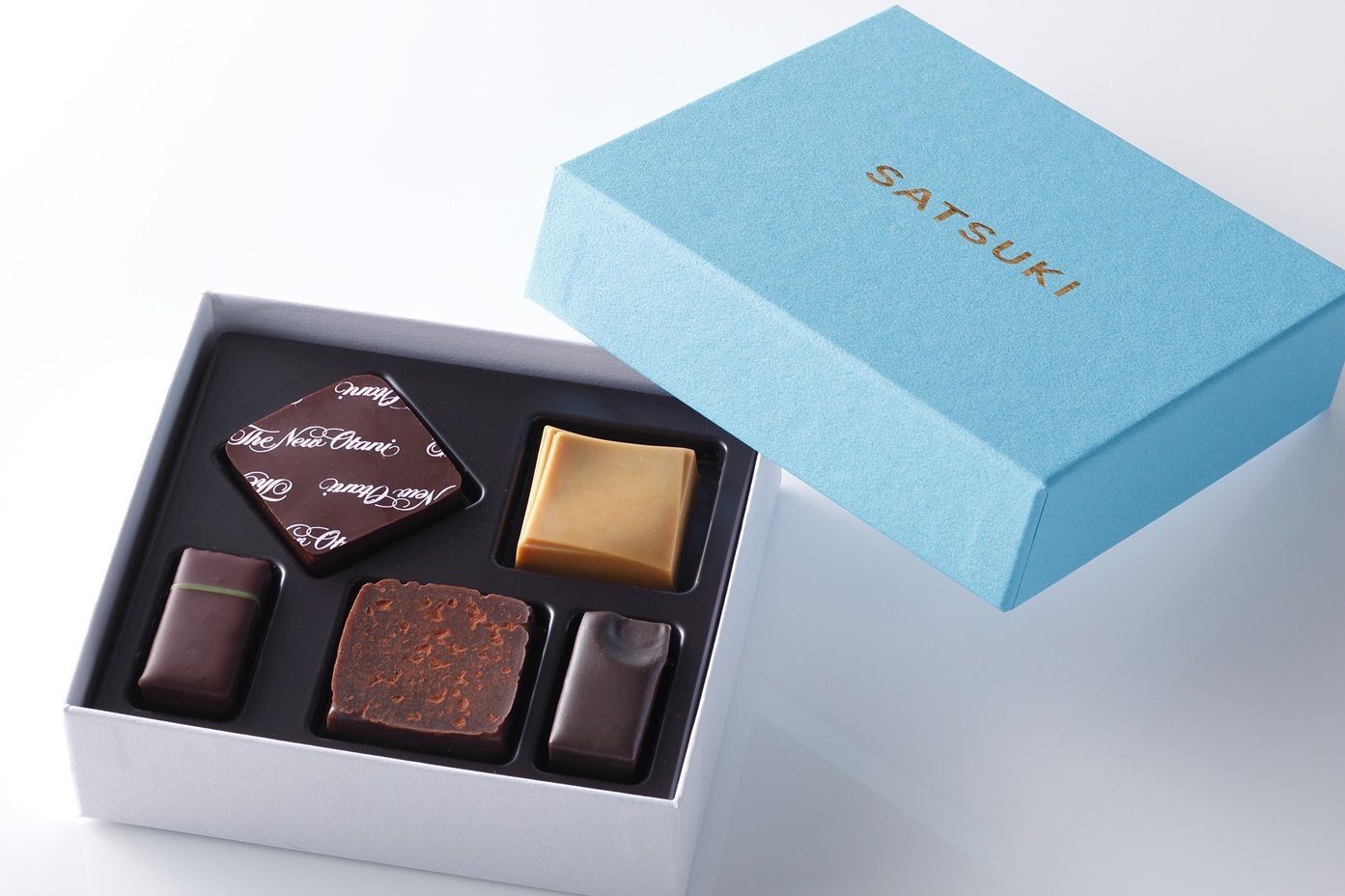 パティスリーSATSUKIとピエール・エルメ・パリが贈るバレンタイン限定のボンボンショコラ。鮮やかなブルーのBOXに、濃厚な"カラメル"、いちごの酸味と甘さ広がる“あまおう”、濃厚な甘みのある「抹茶」、バニラ風味のガナッシュにショコラノワールコーティングを加えた「アンフィニマン ヴァニーユ」、フランボワーズとスパイス風味のガナッシュショコラノワールの「エルザ」のオリジナルチョコレートをそれぞれ詰め合わせました。