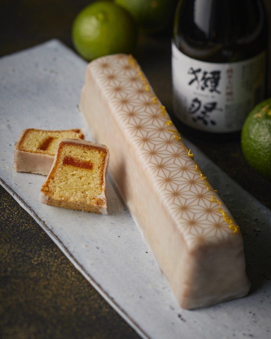 生地には、ゆずきちのエキスと高知県産の黄ゆずを3日間煮詰めたコンフィチュールを練り込み、土台には獺祭の酒粕を使用したシュトロイゼルを合わせ、さくさく・ほろほろとした食感が楽しめます。ケークの中央には、ゆずきちとマンゴーのゼリーを忍ばせ、淡い酸味の中にマンゴーの甘みがふわりと広がります。さらに、麻の葉模様をプリントしたグレーズにもゆずきちエキスを使用し、香りの余韻をより一層引き立てています。