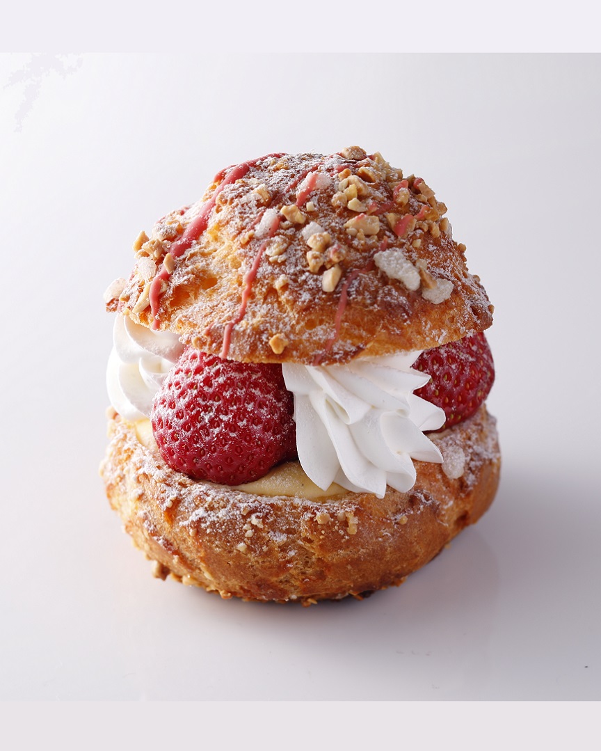 カスタードクリームの下には、黒蜜あんこやあまおうジュレ、スポンジ生地を忍ばせ、旬の「博多あまおう」と九州大牟田産生クリームを絞りました。ホテルオリジナル雑穀“Jシリアル”入りサブレが食感のアクセントを演出します。