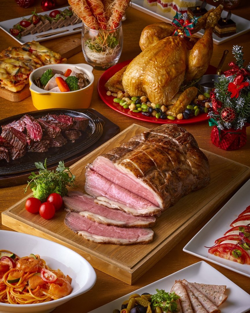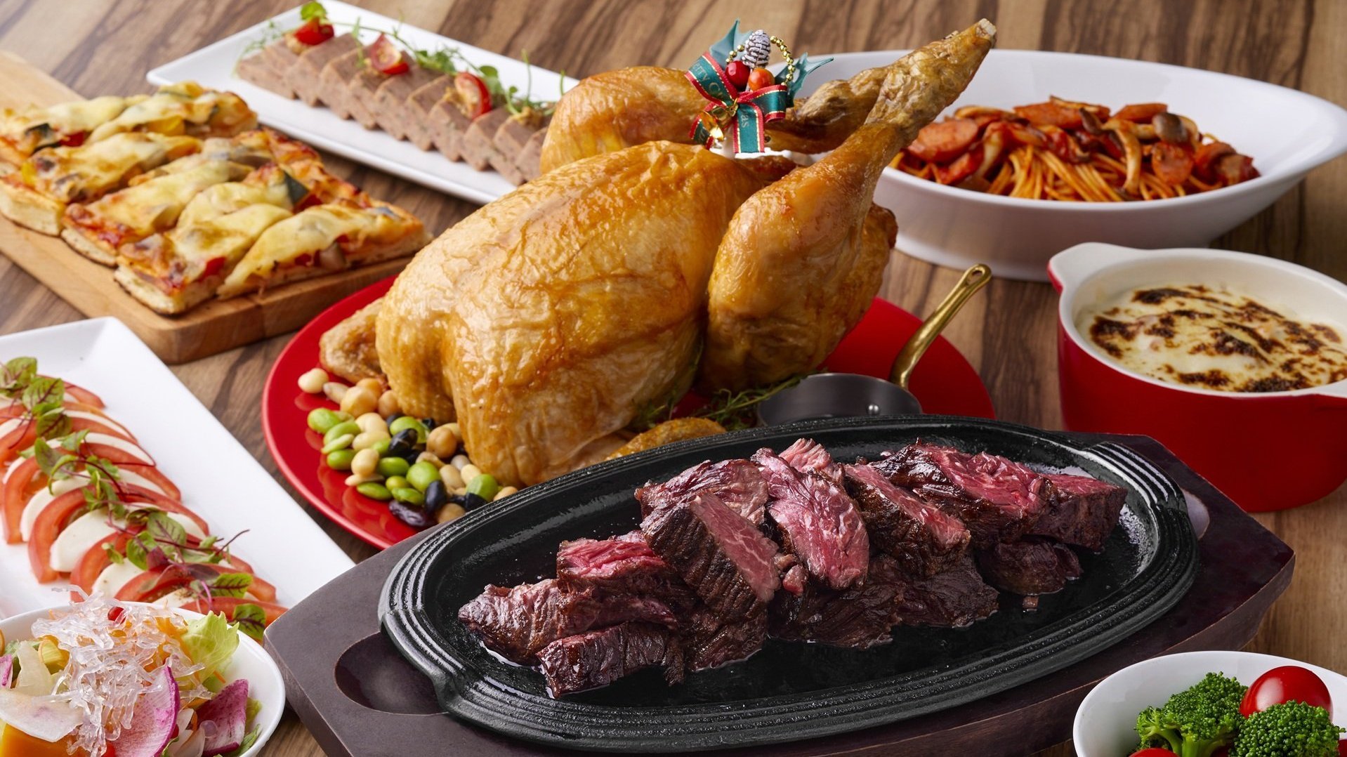 クリスマスの定番 ローストチキンやラザニア、ピザなどのホットミール、オードブルやスイーツなどの料理がずらりと並びます。ファミリーやお友達とのクリスマスランチにいかがでしょうか。