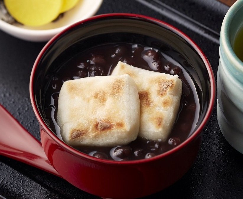 北海道産小豆のぜんざいに、焼餅を添えたシンプルな甘味です。お口直しの塩昆布付き。