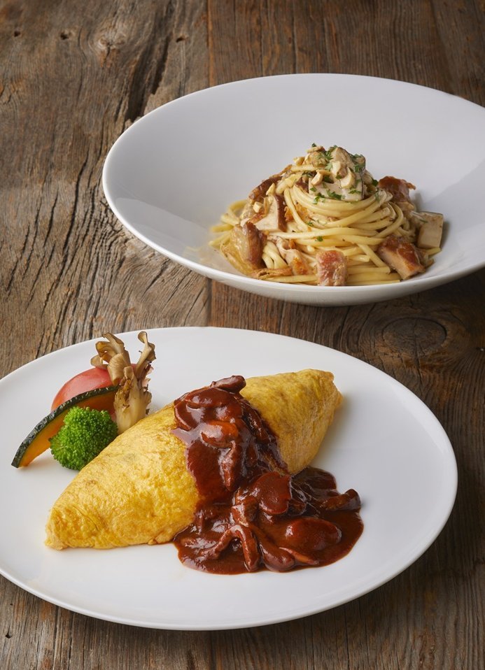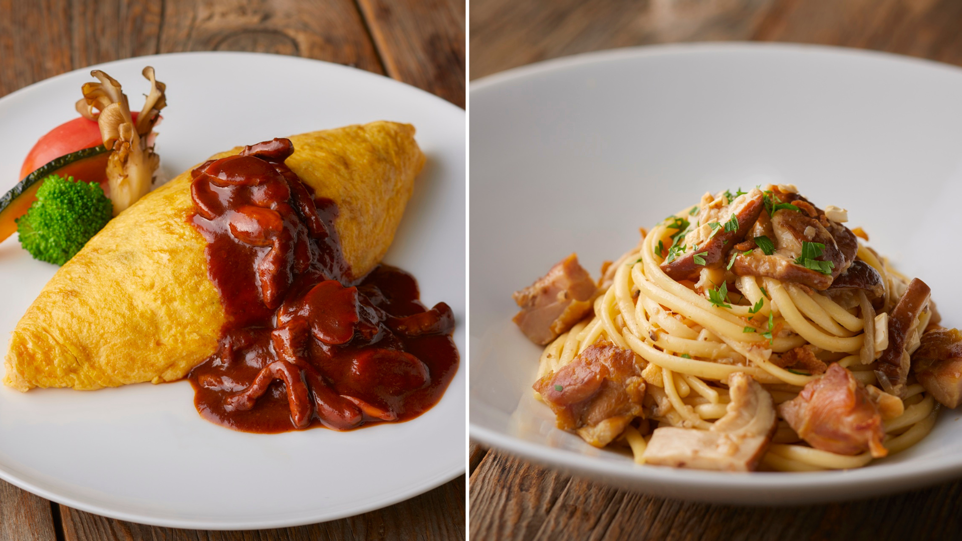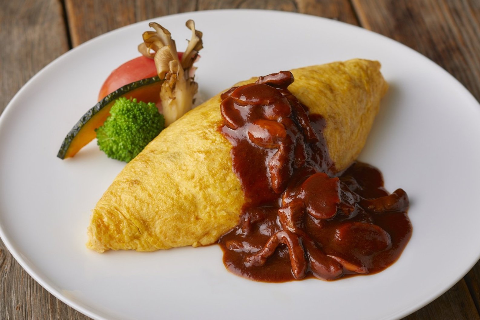 生姜ときのこを混ぜ込んだ十八穀米ごはんのクラシックオムライスに、コク深い国産牛の特製デミグラスソースをかけて仕上げました。やさしい生姜の香りときのこの旨みが広がる、秋にぴったりのオムライス。