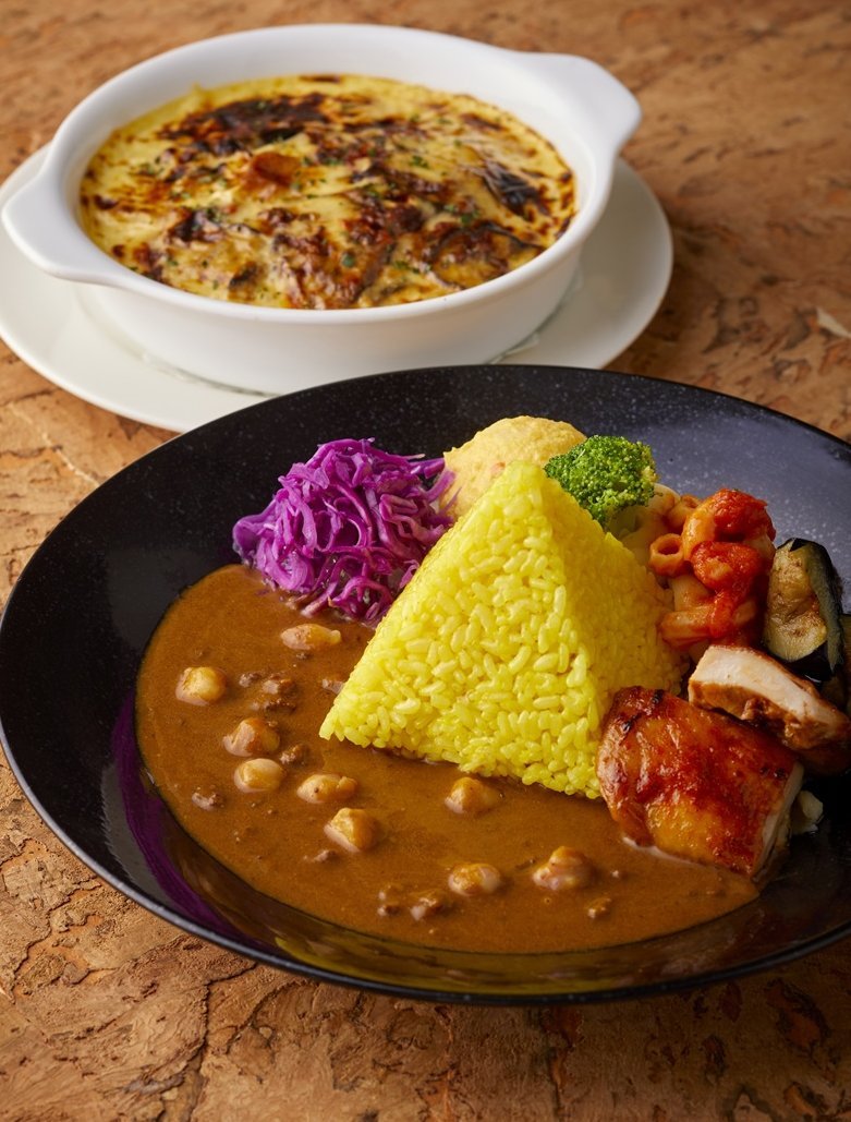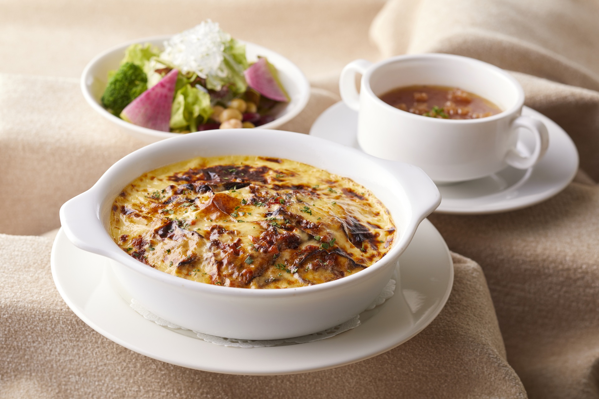 東地中海沿岸の伝統料理「ムサカ」をイメージし、博多なす、じゃがいも、ひよこ豆、マカロニにミートソース、ベシャメルソース、パルメザンチーズを合わせてグラタン仕立てに。