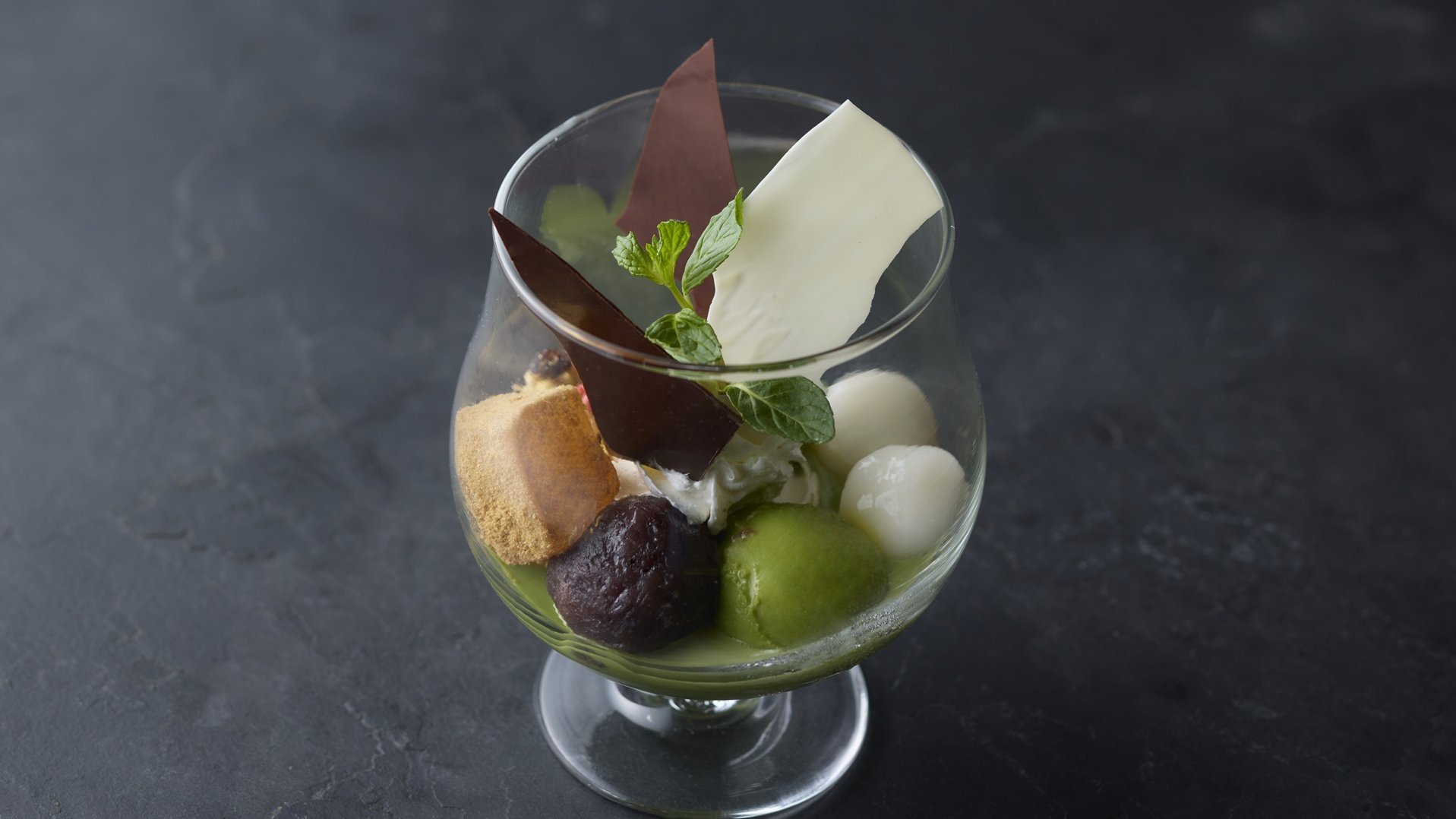 抹茶と小豆の和風パフェ 1階カフェでもお召し上がりいただけます