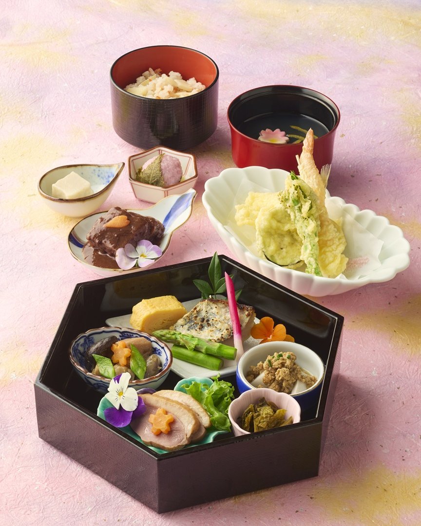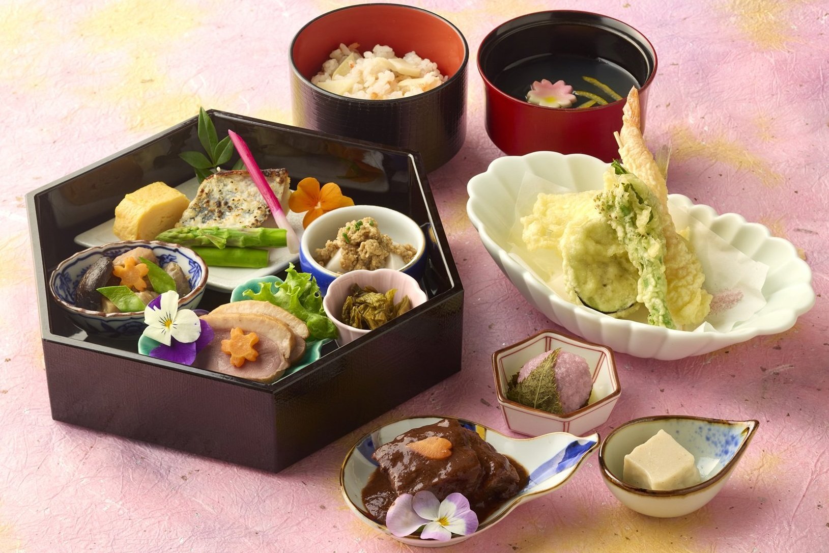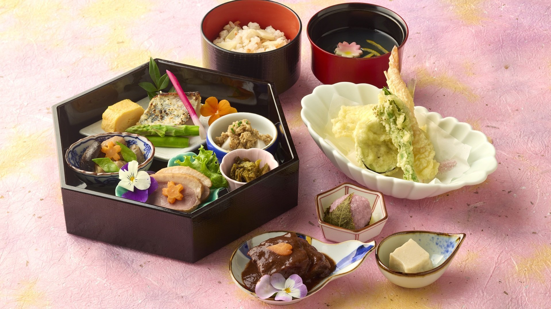 牛バラ肉の和風赤ワイン煮込み/鰆塩麹焼き/鴨スモーク/がめ煮 胡麻豆腐/里芋のあんかけ 天ぷら盛り合わせ 桜海老と筍の炊き込みご飯 吸い物 桜餅