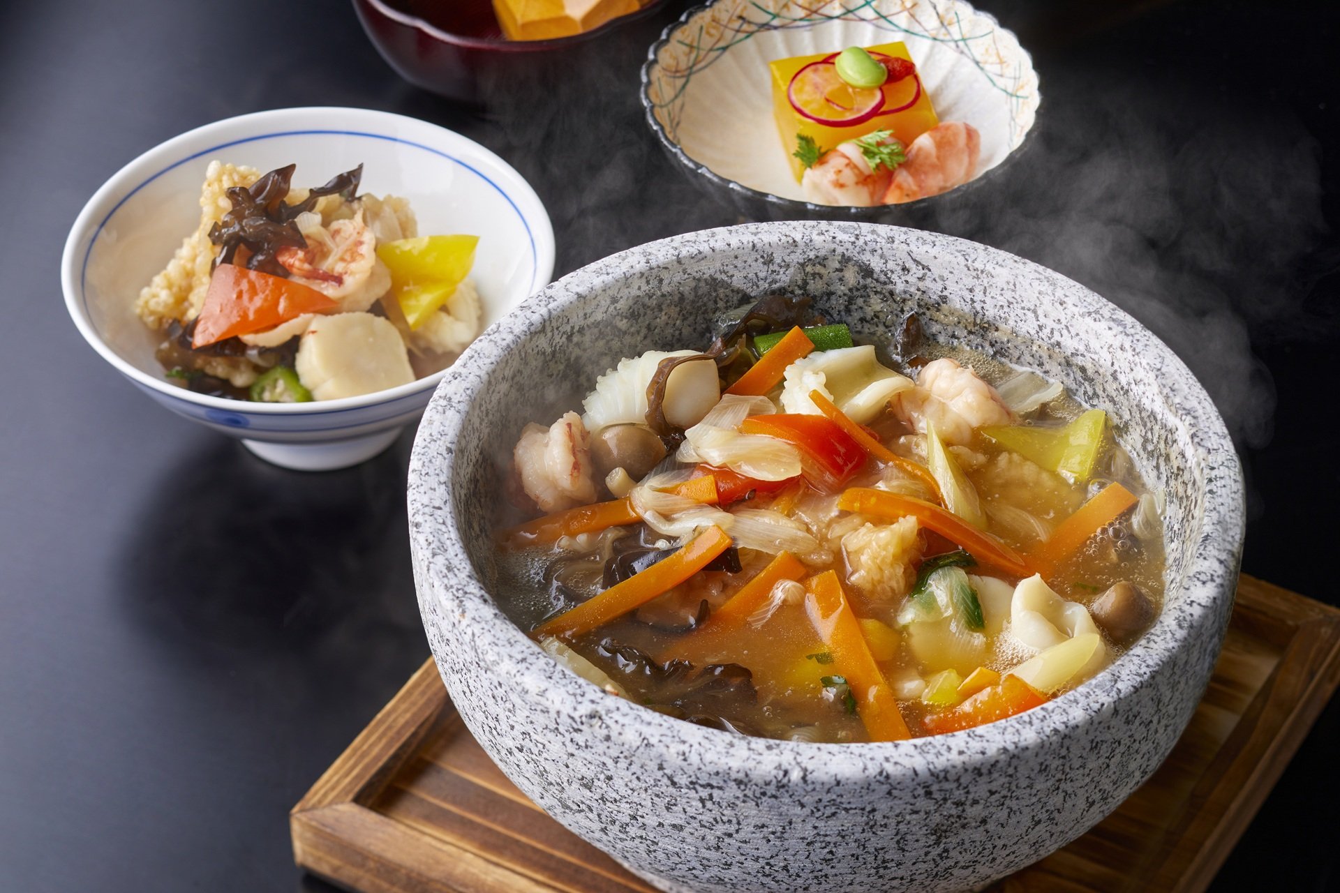 石焼き海鮮おこげ(海老・いか・貝柱・彩り野菜の和出汁あん・おこげ5枚)、本日の小鉢付き