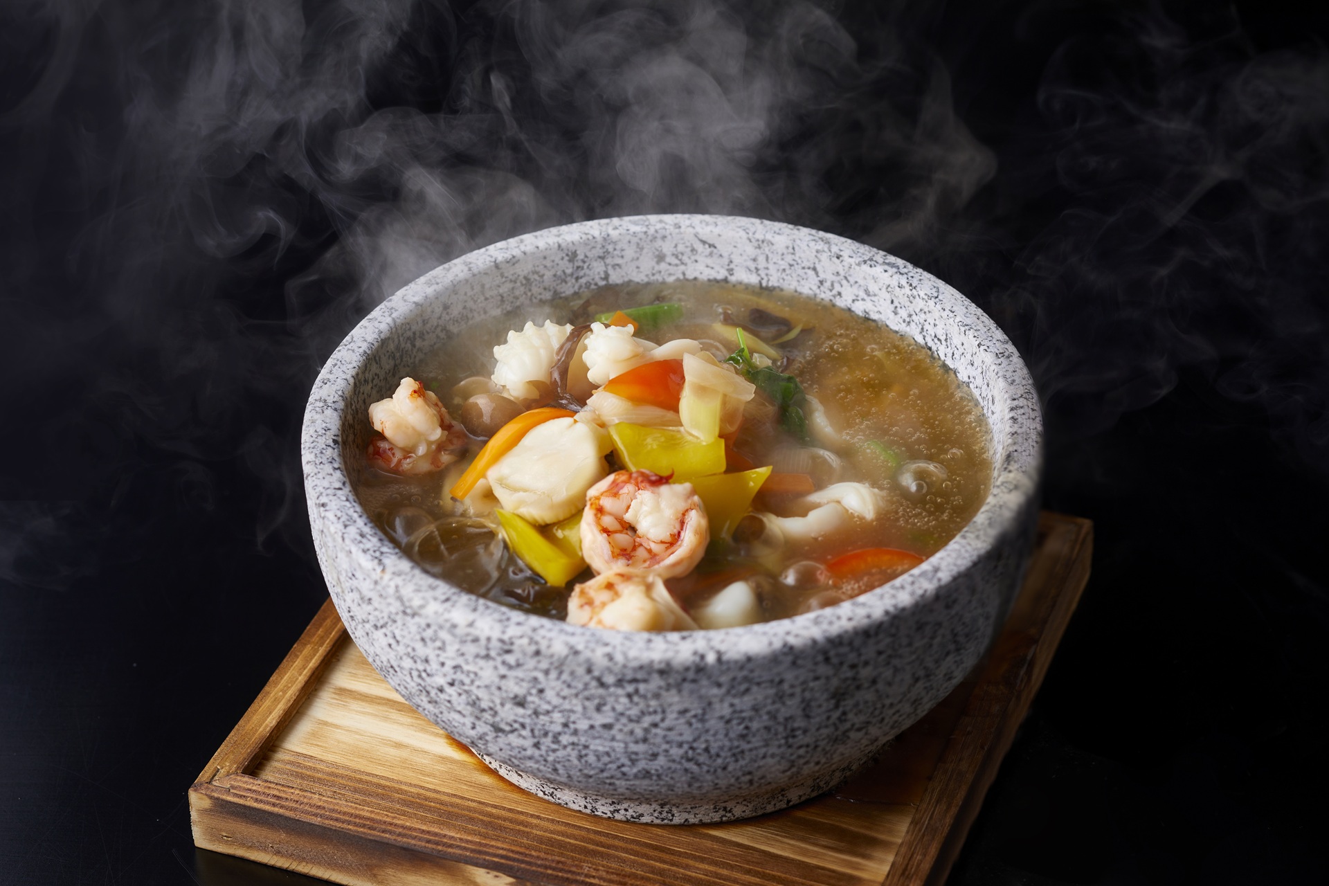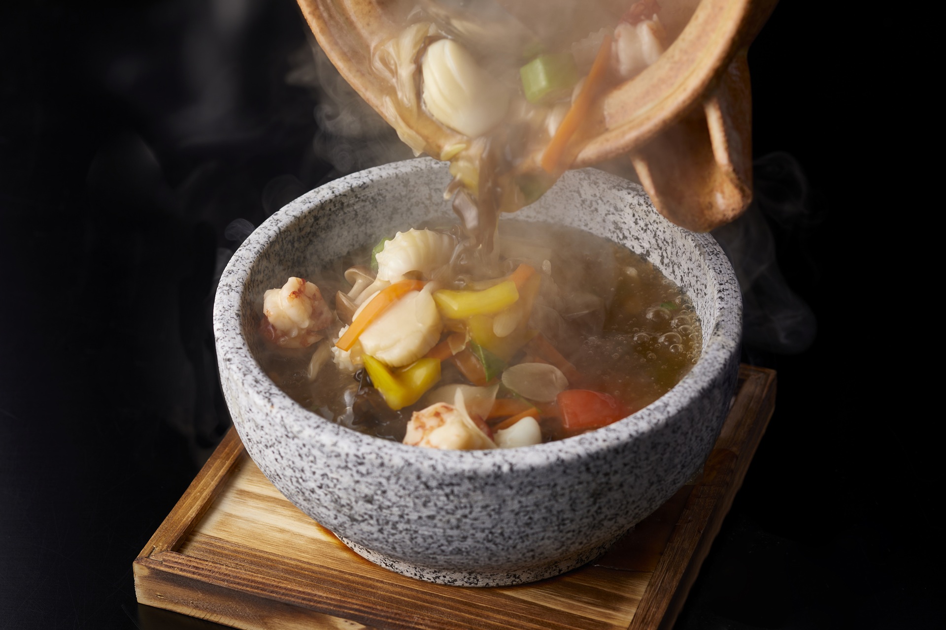 熱々の石焼きなべのおこげにかけるのは、和出汁ベースの海鮮あん。目の前でじゅうじゅう立ち上る香りが食欲をそそります。