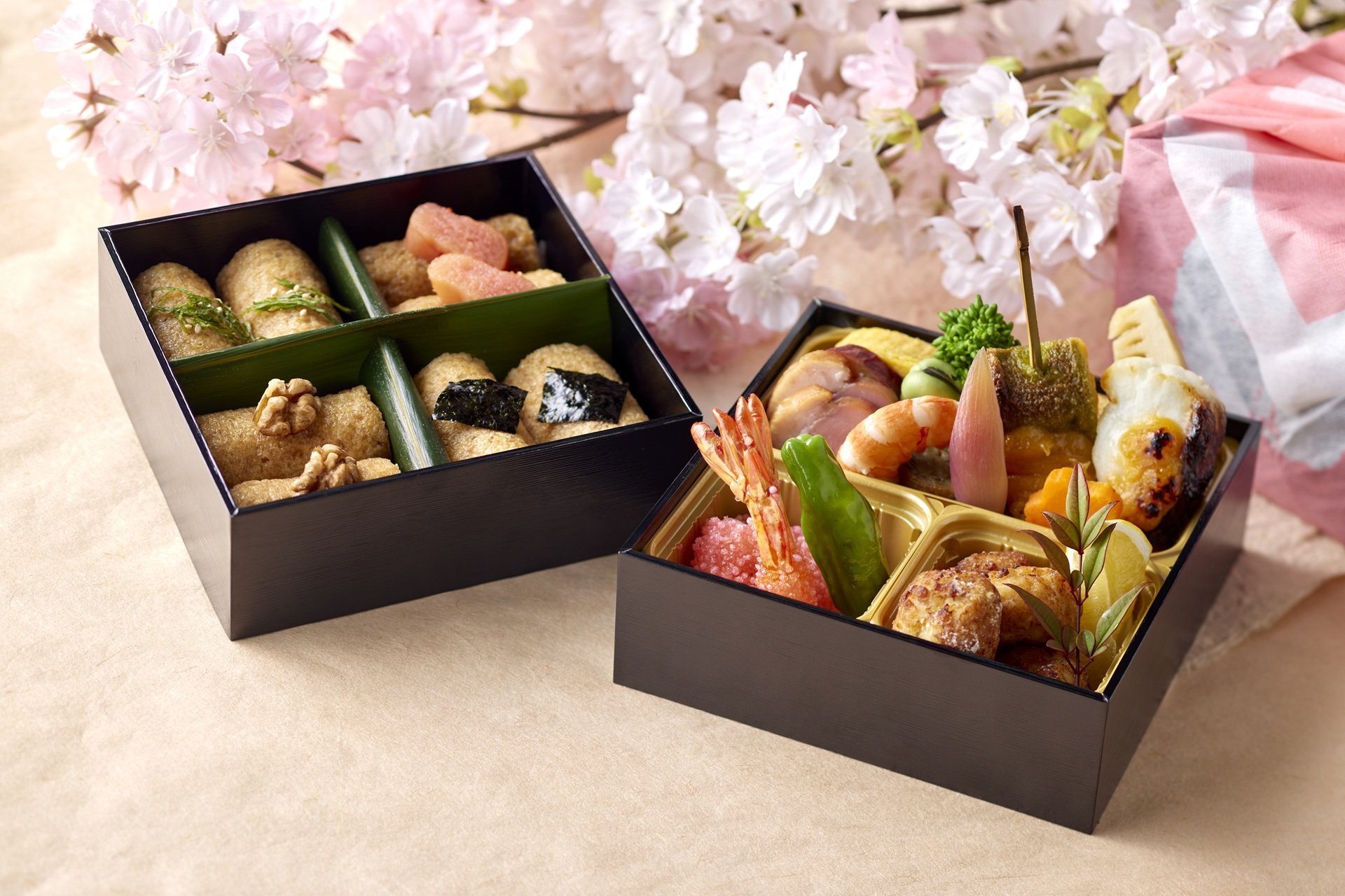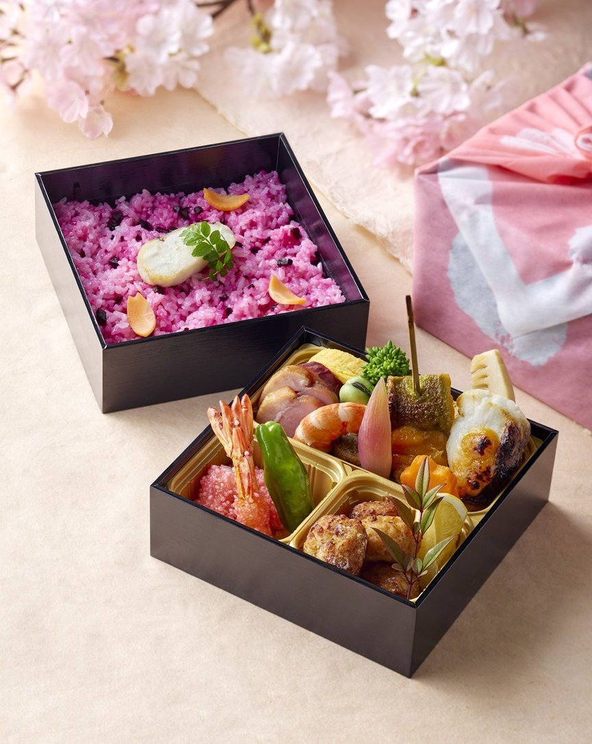桜鯛、筍、空豆、菜の花など食べ応えのある和のおかずを盛り込みました。御飯は桜鯛と紅玉(ビーツ)の華やかな炊き込み御飯、または旨みあふれる南関揚げ出汁いなりをお選びください。