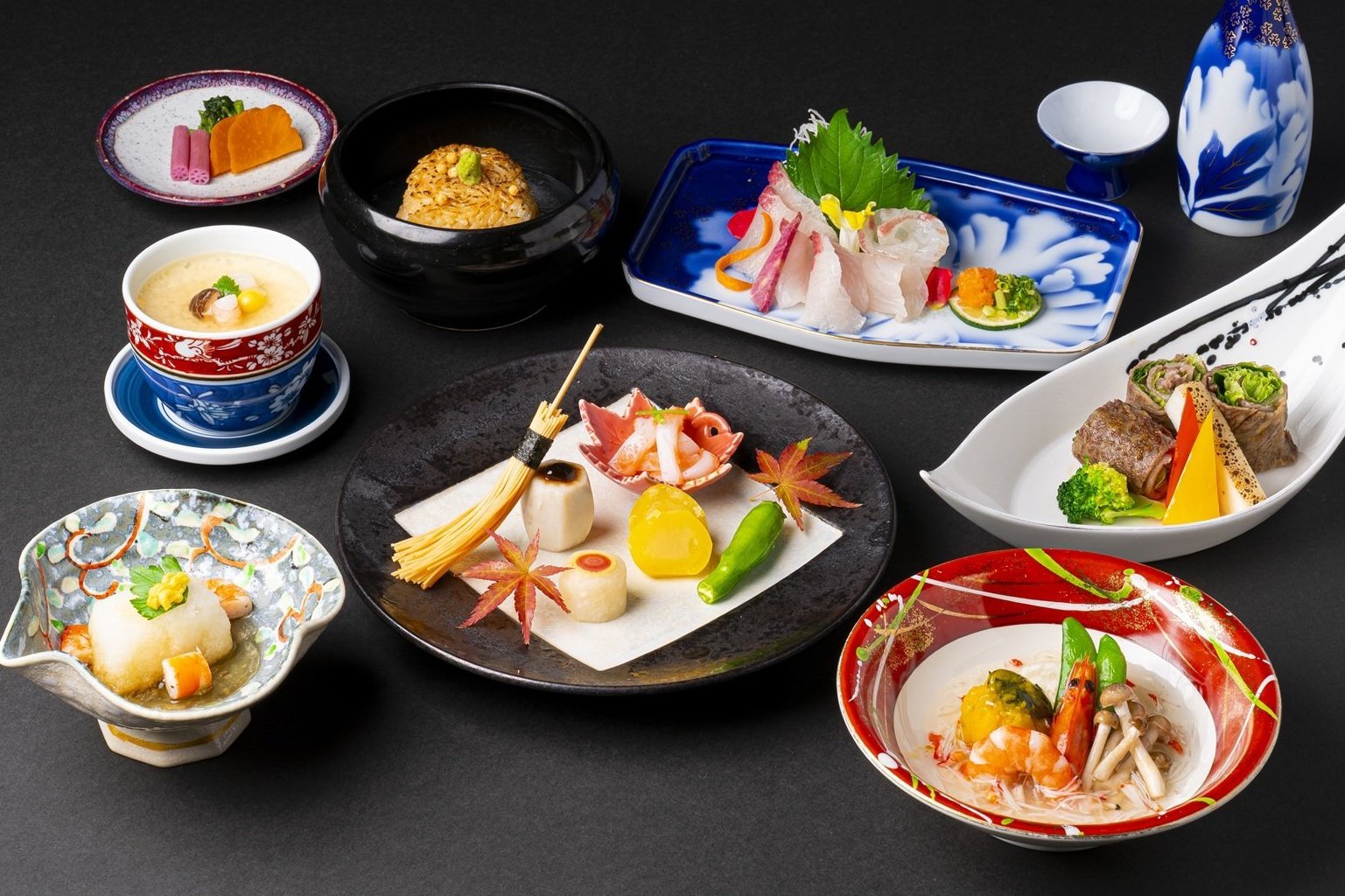 お造り一種・海老フライ・サイコロステーキ・鶏唐揚げ・ポテト・玉子焼・焼魚・サラダ・茶碗蒸し・おにぎり・味噌汁・アイスクリーム