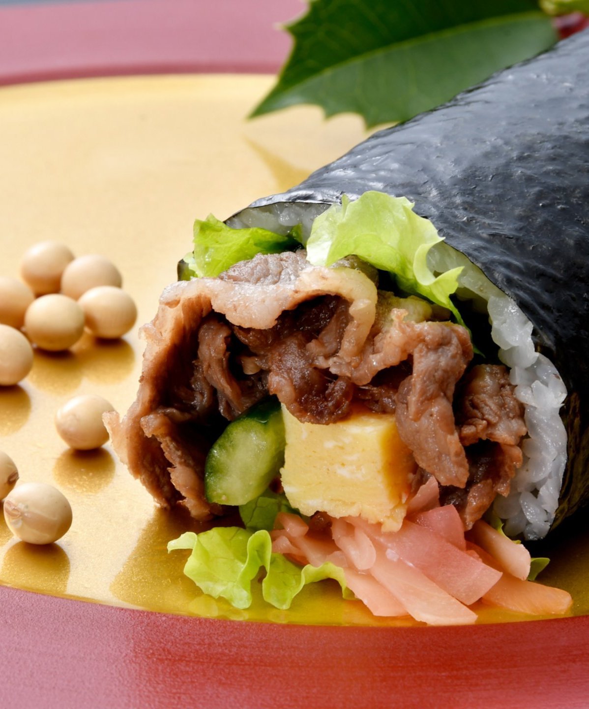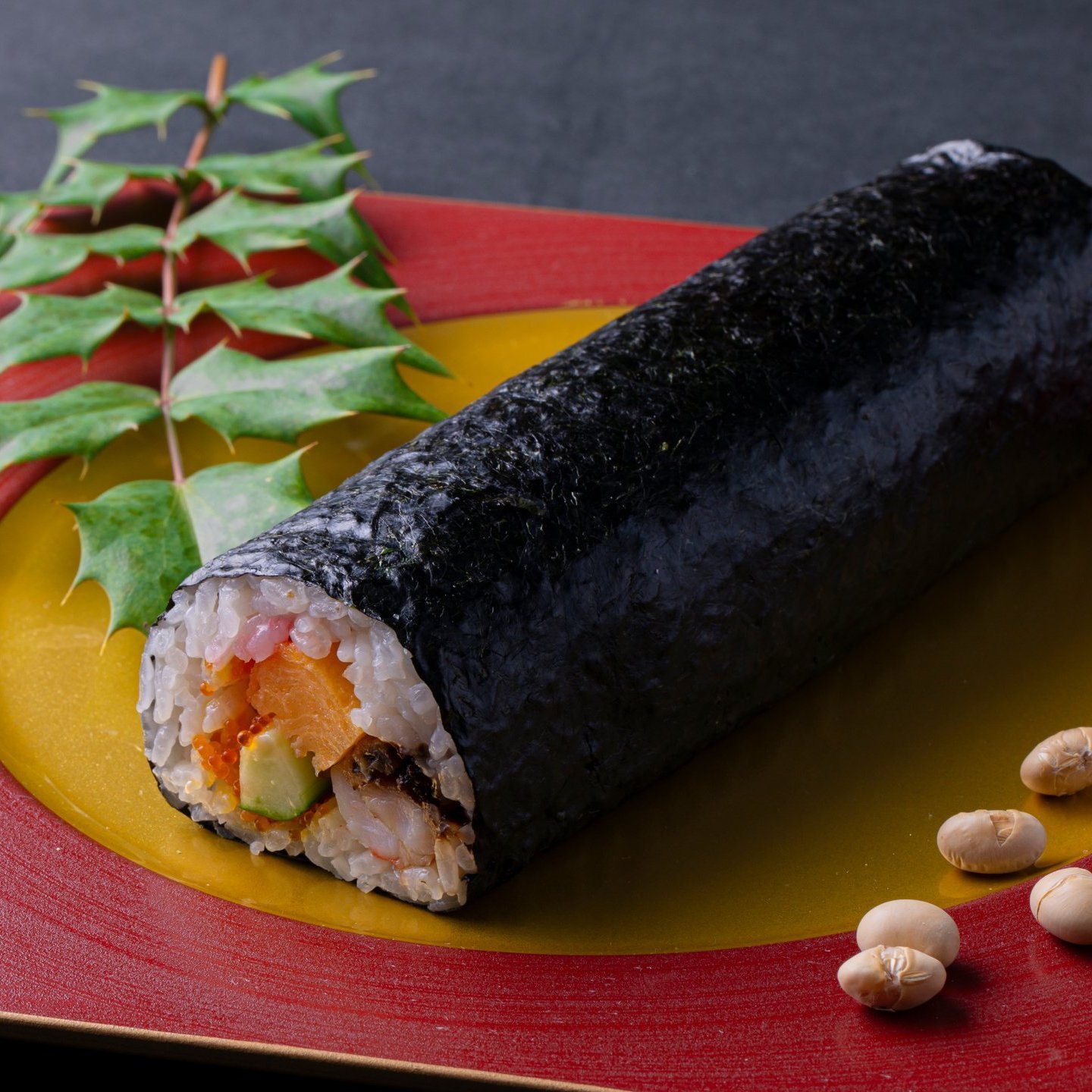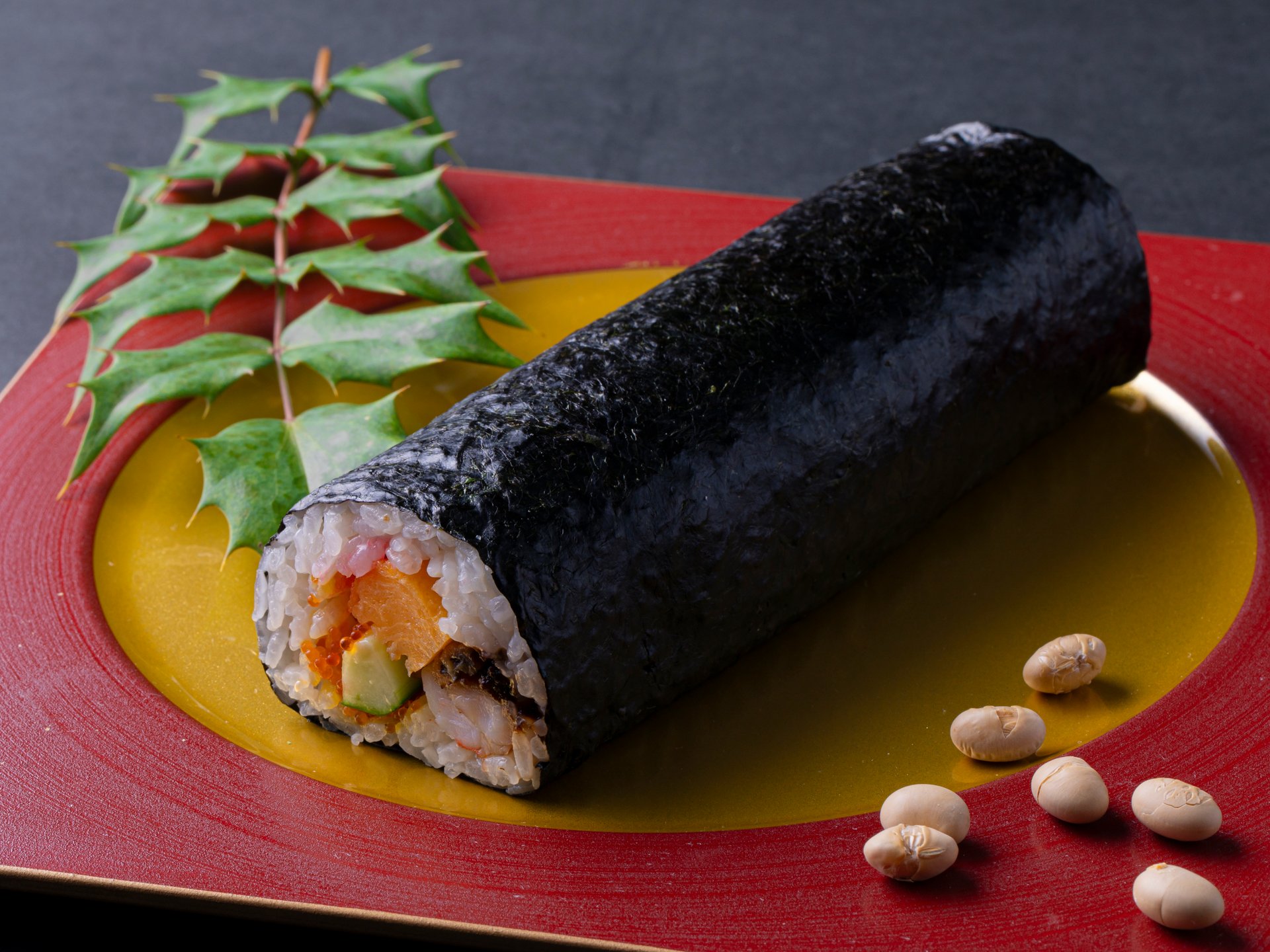 立春に花が開く“花酵母”の蔵・天吹酒造の赤酢を使用した酢飯と七種の具材を佐賀海苔で巻いた、健康と幸せを願う恵方巻です。