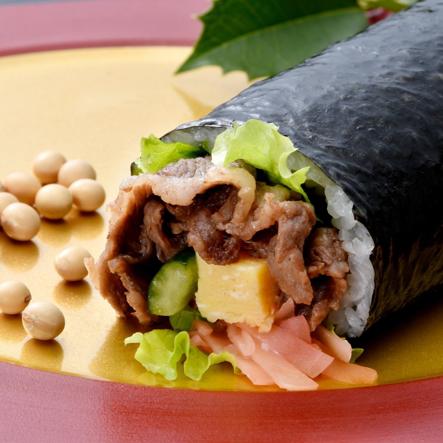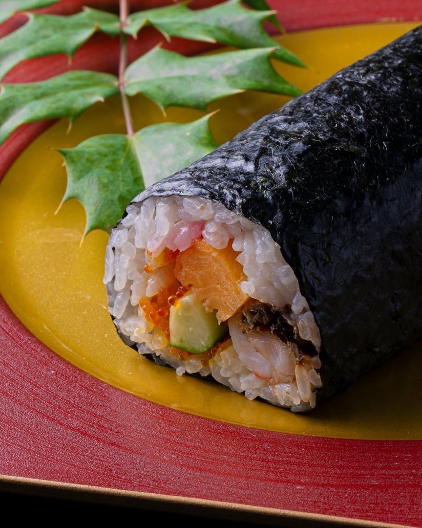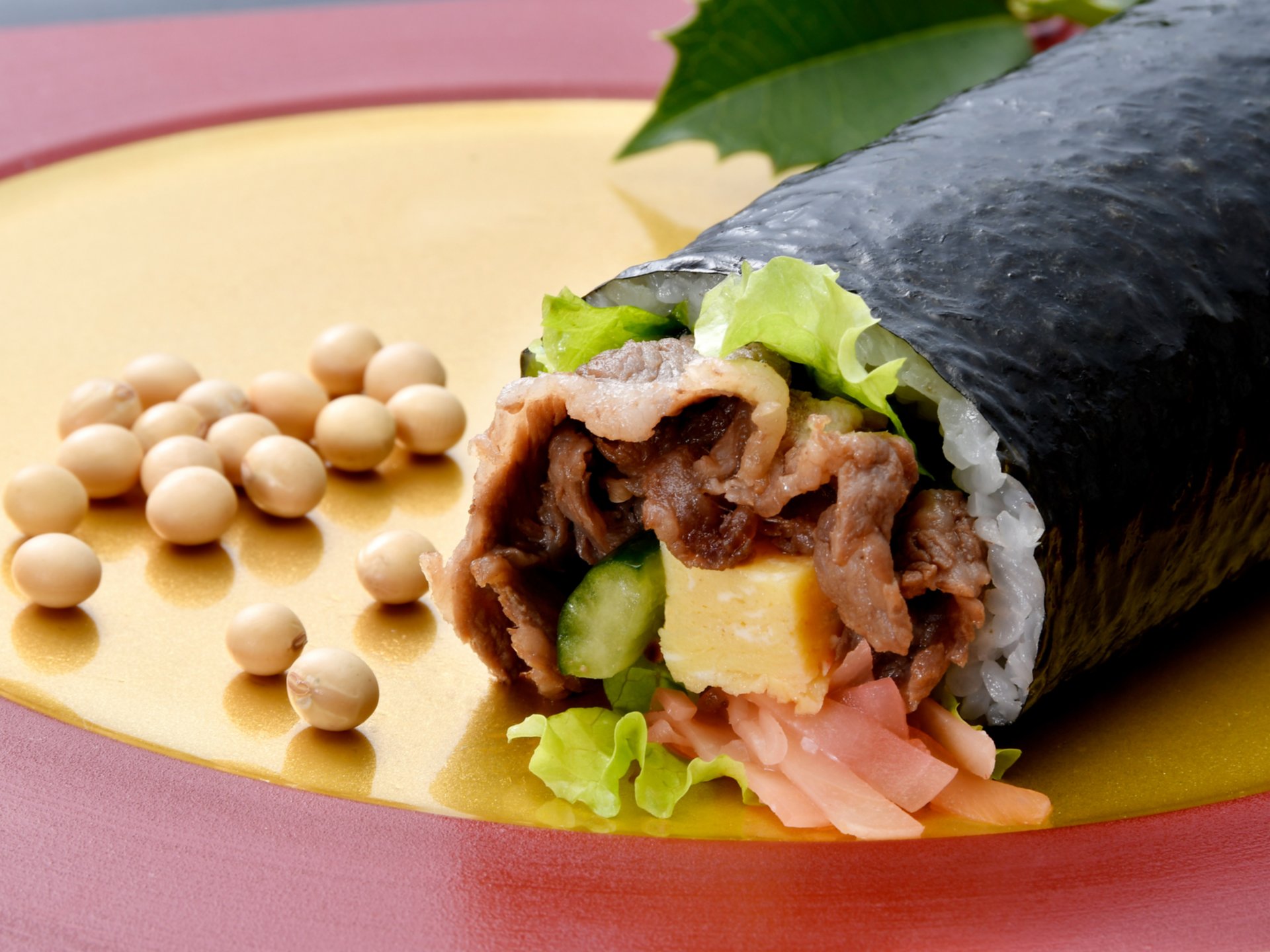 立春に花が開く“花酵母”の蔵・天吹酒造の赤酢を使用した酢飯と七種の具材を佐賀海苔で巻いた、健康と幸せを願う恵方巻です。