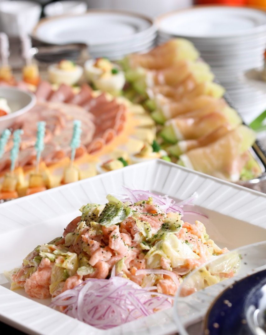 祝い鯛とかんぱち造り/巻き寿司各種(鰻と玉子・佐賀牛・海鮮サラダ)/蒸し鶏のゴマソース/イタヤ貝の特製XO醤和え/スモークサーモンと佐賀玉ねぎのカルパッチョ/チキンとポテトの粒マスタード和え/フレッシュサラダバー