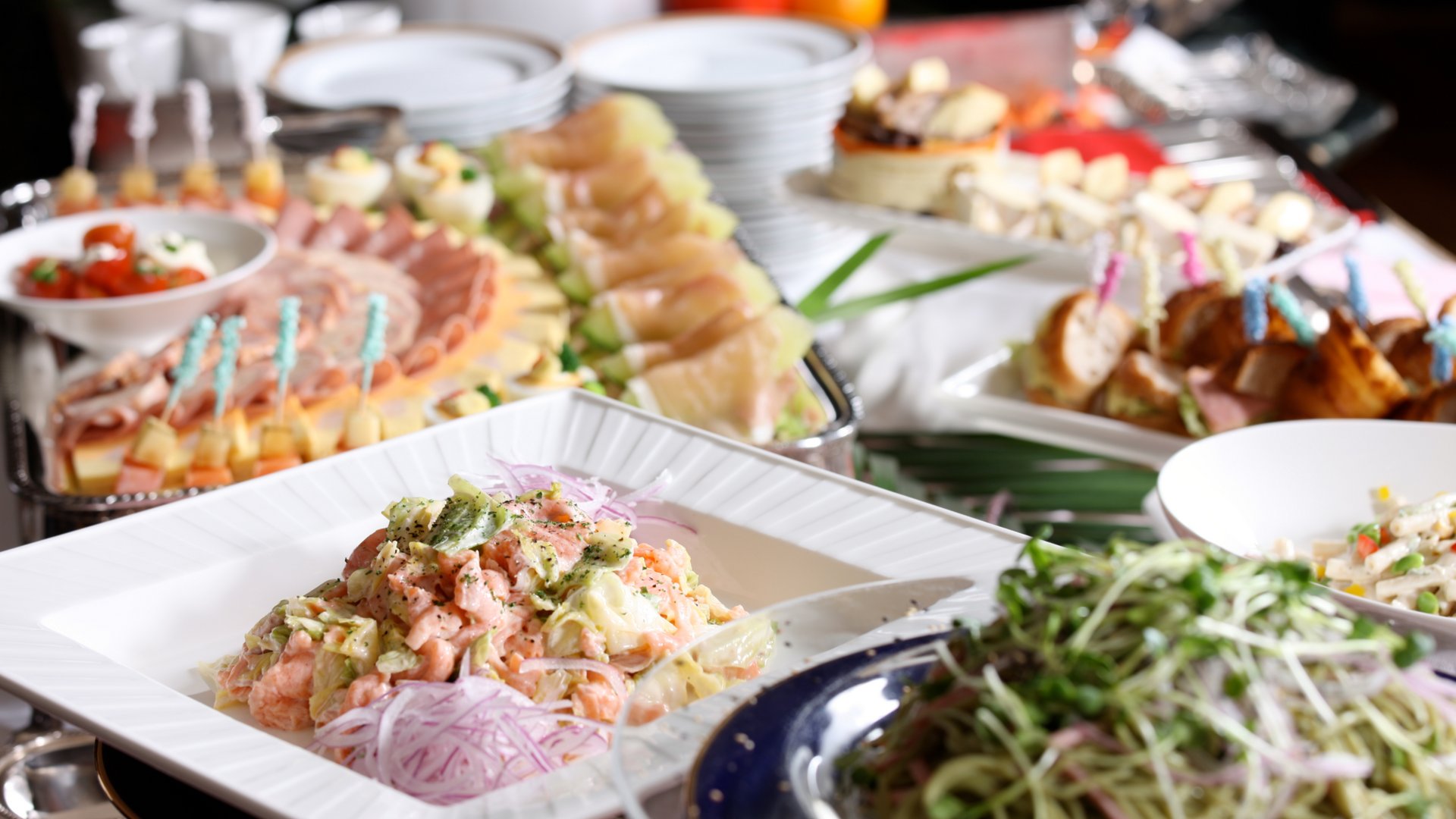 巻き寿司各種(牛肉巻き・海鮮サラダ巻き)/白石蓮根稲荷寿司/蒸し鶏のゴマソース/クラゲの醤油風味/イカとカリフラワーのバジルソース/チキンとポテトの粒マスタード和え/フレッシュサラダバー