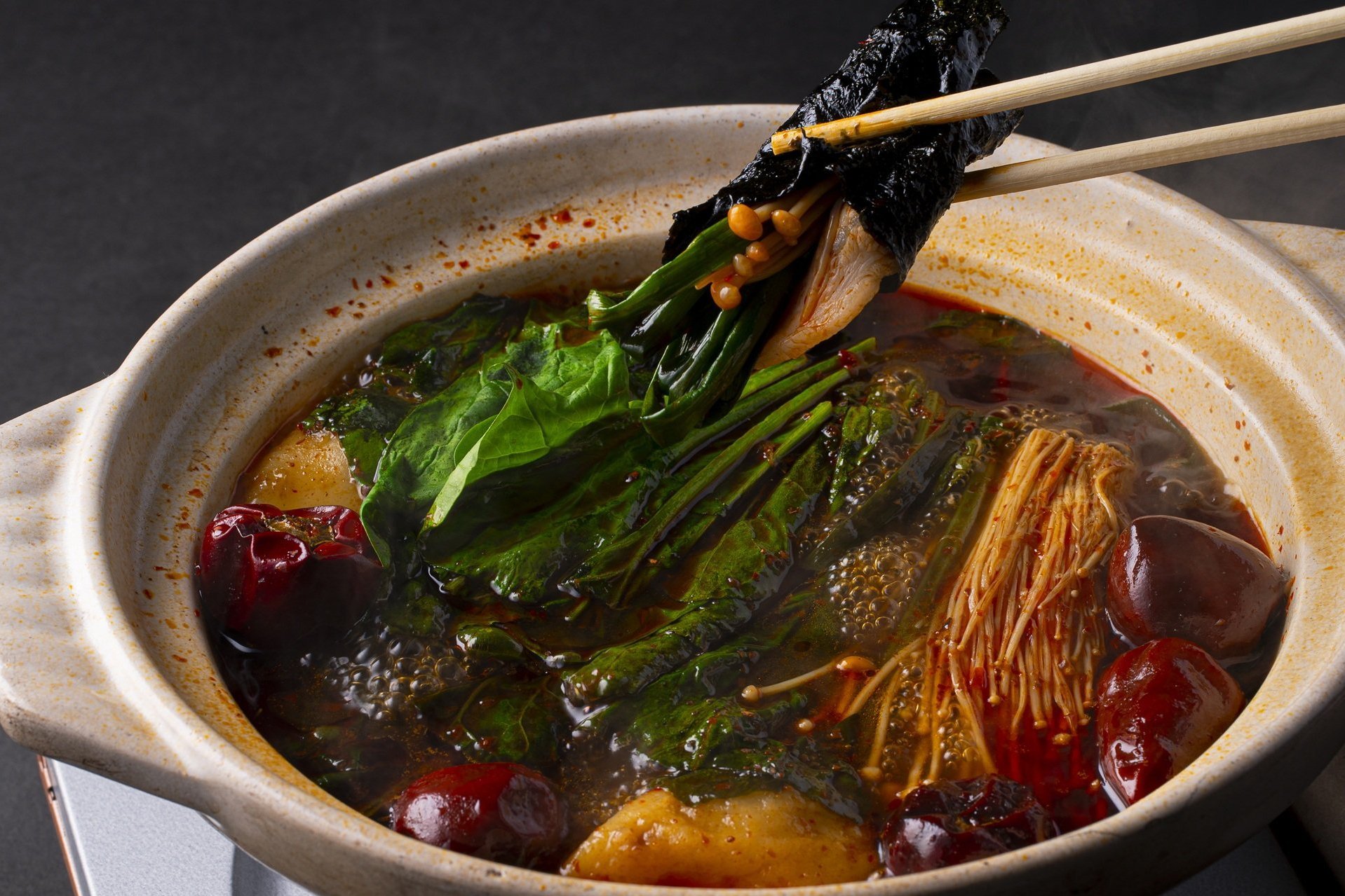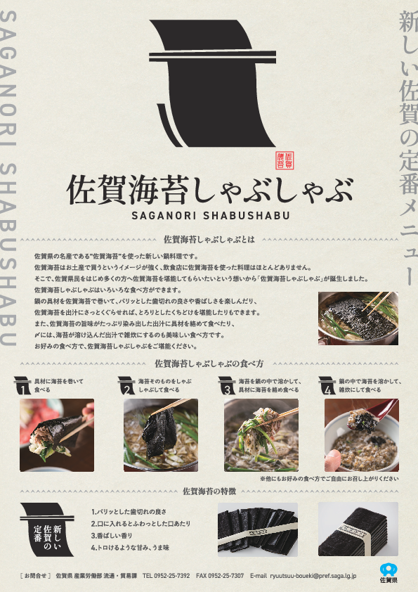 佐賀県の名産である“佐賀海苔”を使った新しい鍋料理を、大観苑風にアレンジしました。鍋の具材を佐賀海苔で巻いたり、旨辛のスープに佐賀海苔をさっとくぐらせたり、お好みの食べ方でご堪能ください。